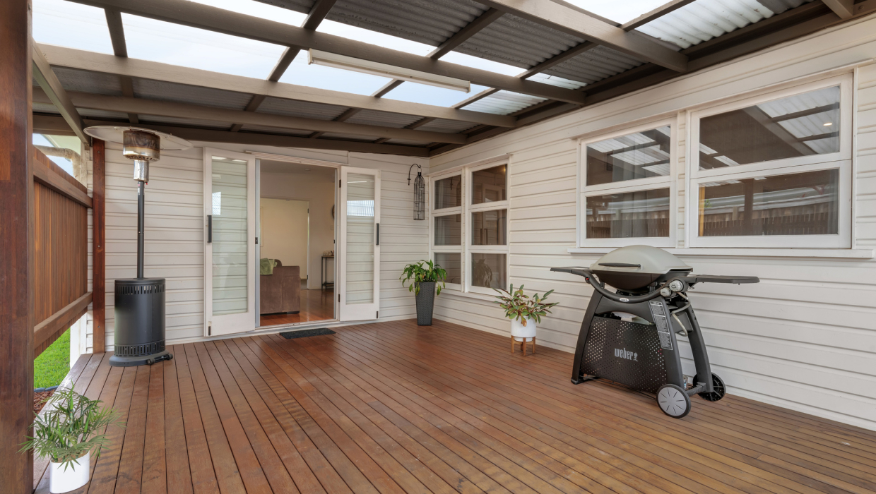The open-plan living area is spacious; it effortlessly extends to a large, covered timber deck, offering a perfect spot to unwind and enjoy the landscaped, low-maintenance gardens.