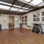 The open-plan living area is spacious; it effortlessly extends to a large, covered timber deck, offering a perfect spot to unwind and enjoy the landscaped, low-maintenance gardens.